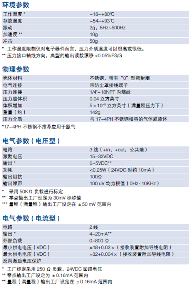 西特将专利技术的不锈钢可变电容敏感元件与坚固的专用电子电路结合在一起,使传感器设计结构简单可靠,保证了传感器具有较高的精度和长期稳定性。它采用17-4PH 不锈钢膜片和一个固定电极构成一个可变电容。当压力变化时,膜片产生微小变形,从而使电容值发生变化。电容值的变化由西特专用电子电路检测,并转换成线性直流输出信号。高电平的0~5VDC 或4~20mA 信号输出不需要任何额外的信号整理电路,从而保证西特传感器具有较高的稳定性、高精度及快速动态响应特性。Model 280E 系列压力传感器可以满足各种高性能的使用要求。
