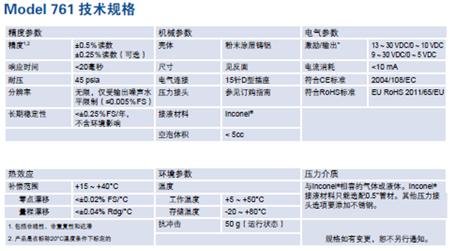Setra Model 761 是一种专为半导体、石化、制药/ 工艺和工业真空市场而设计的低成本电容式真空压力计。该产品采用新型高频电子电路设计,完全符合RoHS 标准,噪声低,响应快,满足当今临界控制应用的要求。此外,它还具有抑制外部噪声、预热快速、不易受环境影响以及归零快等特点,性能远超许多价格多达两倍的同类产品。