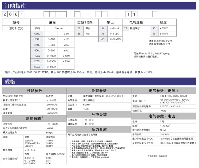 Model 266 系列压力传感器可提供低至0~±25Pa 高至0~5000Pa 的量程。静态精度在常温下为1%Fs,温度补偿范围是-18~+65℃,在温度补偿范围外的热漂移小于+0.06%FS/ ℃。
