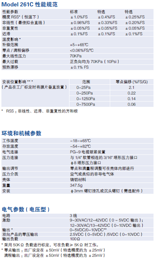 Model 261C 微差压变送器可用来测量差压或表压(静态压力),可选择4-20mA,0-5VDC 或0-10VDC 的输出信号。Model 261C 传感器/ 变送器已经进行了温度补偿,激励电压为24VDC,对于电压信号产品还可以选择24VAC 电源。Model 261 最小测量范围为0~25Pa,在室温下的标准精度为±1%FS,温度补偿范围在+5~+65℃,通过温度补偿电路,使温度影响小于±0.06%FS/℃。