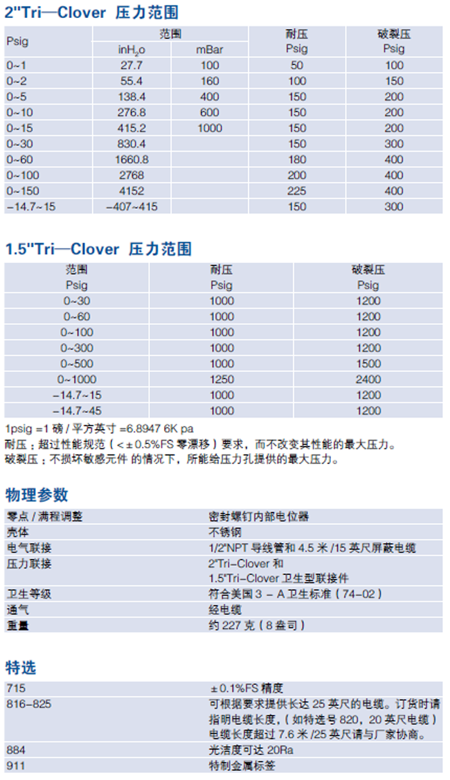 Model 290 设计符合美国3A 的卫生标准,它被封装在不锈钢壳体内,对冲击、振动等恶劣环境极不敏感,另外高温消毒时,热冲击不会对其性能产生任何影响,因此设备清洗消毒无需拆下。Model 290 压力变送器配有1/2"NPT 导线管,采用屏蔽电缆将变送器内部与大气相通,可通过调节螺钉对零点和满量程进行调整。Model 290 是食品、医药行业中气压压力或液位测量的选择。